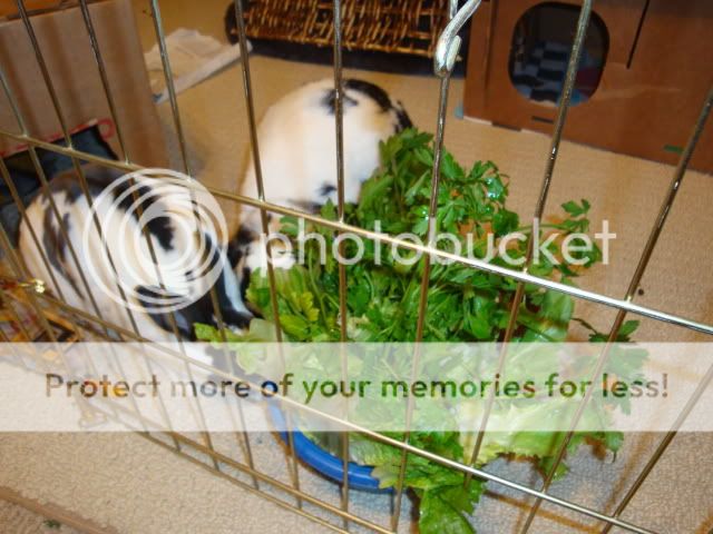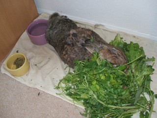 I read in a book recently to give your bunny a pile of greens the SIZE OF THE BUN each day. I think I have that about right… lol!
