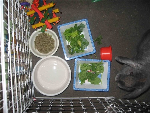 Just a suggestion, it hasnt worked for me but Lucy is much more stubborn then the avergae bun. Easier to explain with a picture, but this way she has to come in contact with the veggies when she is hungry and usually has to sniff them, then figure out a way around them.