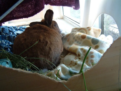Most bunnies will dig, push, and chew on bedding to get things positioned just right, but I always thought Vivian was the hardest to please. The only reason she didn’t mess with her bedding as much in the window box is because in the past, Jack was happy with whatever soft bedding was around him (as long as I built up the sides pretty high so he felt protected –sort of like a natural scrape that rabbits make in the ground, and probably for warmth too.) Vivian would still try and rearrange their window seat bedding but his weight prevented her from doing it too much and so she’d just give up and hang out.
