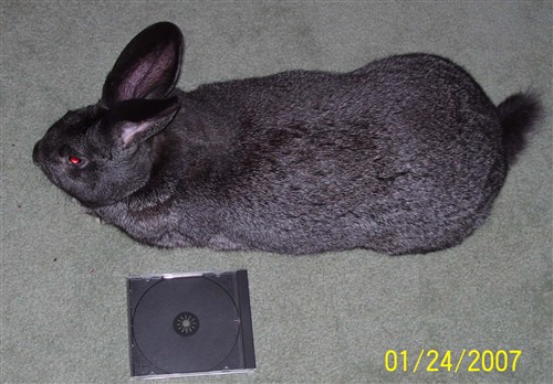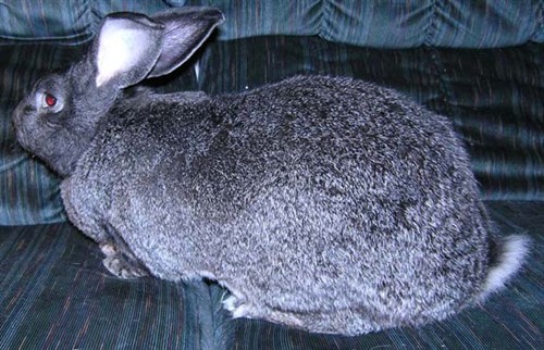 O.k. so lets try this again, this is Barney a Flemish Giant. He did last year, he came to me because the owner no longer wanted him and was looking for a good home. Barney, came to me with two large abcessess on his neck. One broke and drained on its own and the other had to be done by my rabbit savy vet. Disgusting but interesting to watch, Barney never really shook the bacteria and was on and off antibiotics his entire time with me. He did however, win best of breed and best of variety at a regional flemish giant specialty show. With all of that said here is Barney. He is collor is Steel, super sweet boy, he would sit in your lap, on your lap on his back for hours. He was a lover bun.![]()