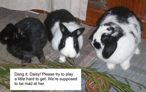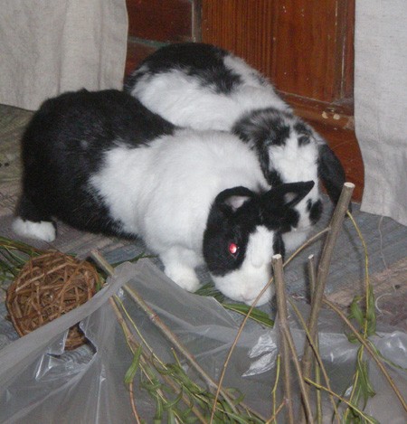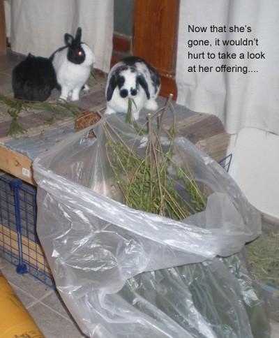 since I didn’t have fresh greens for them this morning, I forgot to stop by the store on the way home late last night it may go a long way to get me out of Bunny Heck. You talk about a lot of stinkeye and thumping going on. I gave them a few grapevine leaves and split the rest of what I had left *pitiful* and lots of hay.