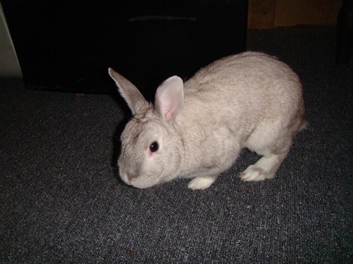I got Binny from a friend who had an opps litter, and she didn’t know what breed he was.  I have looked at different breeds and i think from the pictures he may be an amercian rabbit? Not sure .. anyone have any ideas?  When we first got him he started off pure white, and after a few sheds he has gray hairs.  He weighs about 7 or 8 pounds.