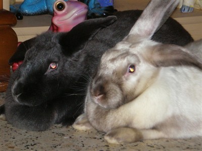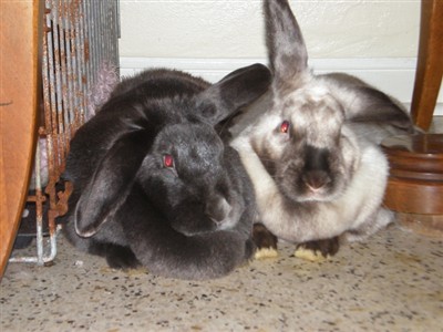 BlueBella-Donna (blue-black) and Cleopatra (siamese) were both saved in Febuary this year from the fair. Satin in breed. Cleo is stil shy but comming around but BlueBella is my lap bunny. If I sit on the floor she climbs right on up.Came from the same breeder so I think they might be related in some way. Might be why they bonded immediately.I think they are both a little over a year old. My favorite thing is to watch them do binkies,they are so big they shake the ground and scare the cat….lol
