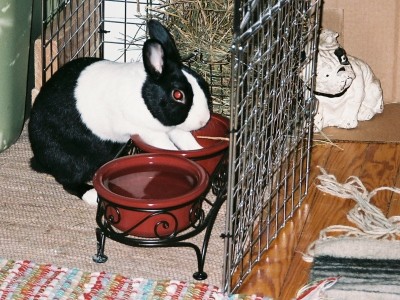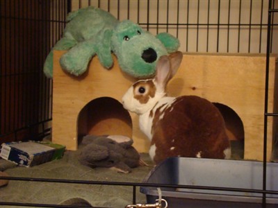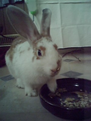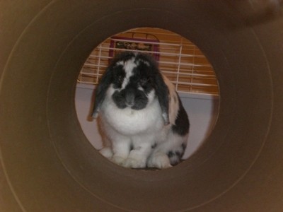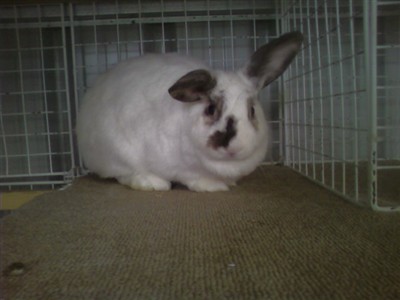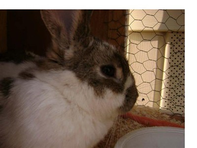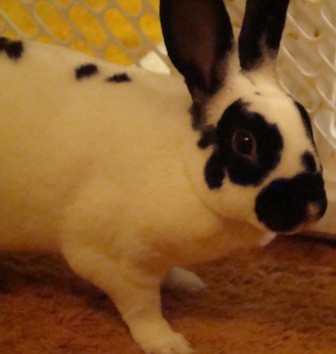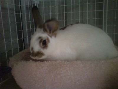 Lizzy is a 1 year old girl (English Spot, the shelter said), fixed, whom I adopted 6 weeks ago from a rabbit rescue, where they said she was a sweetheart… Hmmm…