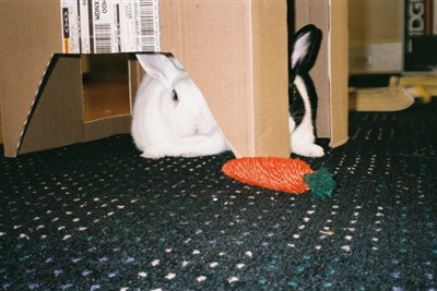 This is Vicky and Roger, my two Dutch babies. They are very smart, very fiesty, and very sweet. They groom each other constantly and are CRAZY about pellets. They love their cardboard castle AKA cottontail cottage.