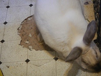 Guin is too shy to leave her bunny room without Lancelot, so she digs up the 3 layers of pee pads I have on the carpet for his incontinence. she chewed a hole into my boyfriends c-pap machine air hose.