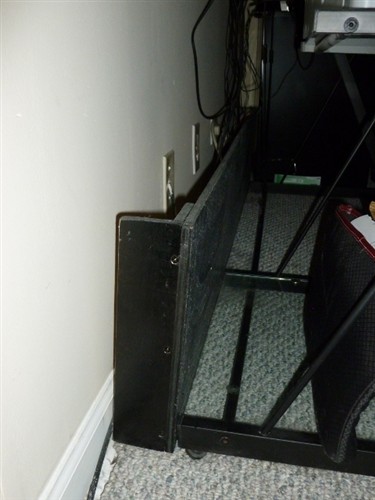 I’m fortunate to be married to a carpenter –  this is what he built to protect wires behind outv console and computer desks.  I asked him to paint it black – so it would blend in.