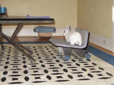 Learned a few things along the way – can’t us a stencil on something bumpy, getting sick really slows things down, etc . . . My goal is to get rid of the ugly black rug – a free remnant I got solely for the buns – So, I will be making some more rugs!