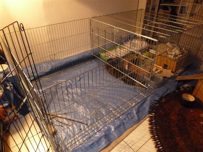 This is a photo of the reduced size pen where somebun (to yet be identifed) was managing to pee on the cardboard between the blue water bowl and the dig-box I put in there…. gggrrrr – and although you can’t see it on the photo, the nice, new, heavy duty, waterproof blue tarpaulin is no longer new, heavy duty, or waterproof, thanks to the numerous holes made by digging, chewing, pulling and clawing by the inhabitants