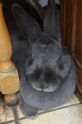 She is an unaltered, female Vienna Blue. Lives 40% indoors (open ktichen) and 60% outdoors (she’s free-run with a 3 storey bunny condo made from converted-kitchen dresser). She is more than happy in company of resident cat and recently rainbow’d family dog.