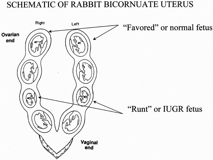Now, to be fair, a bunny uterus is not quite as small as a pen nib. The sausage bits you see are probably the two uterine horns. They are, indeed, grossly enlarged, but they do look like small breakfast sausages in normal circumstances. Buns have a duplex uterus and each “sausage” holds baby buns like a pod holds peas. ![]()